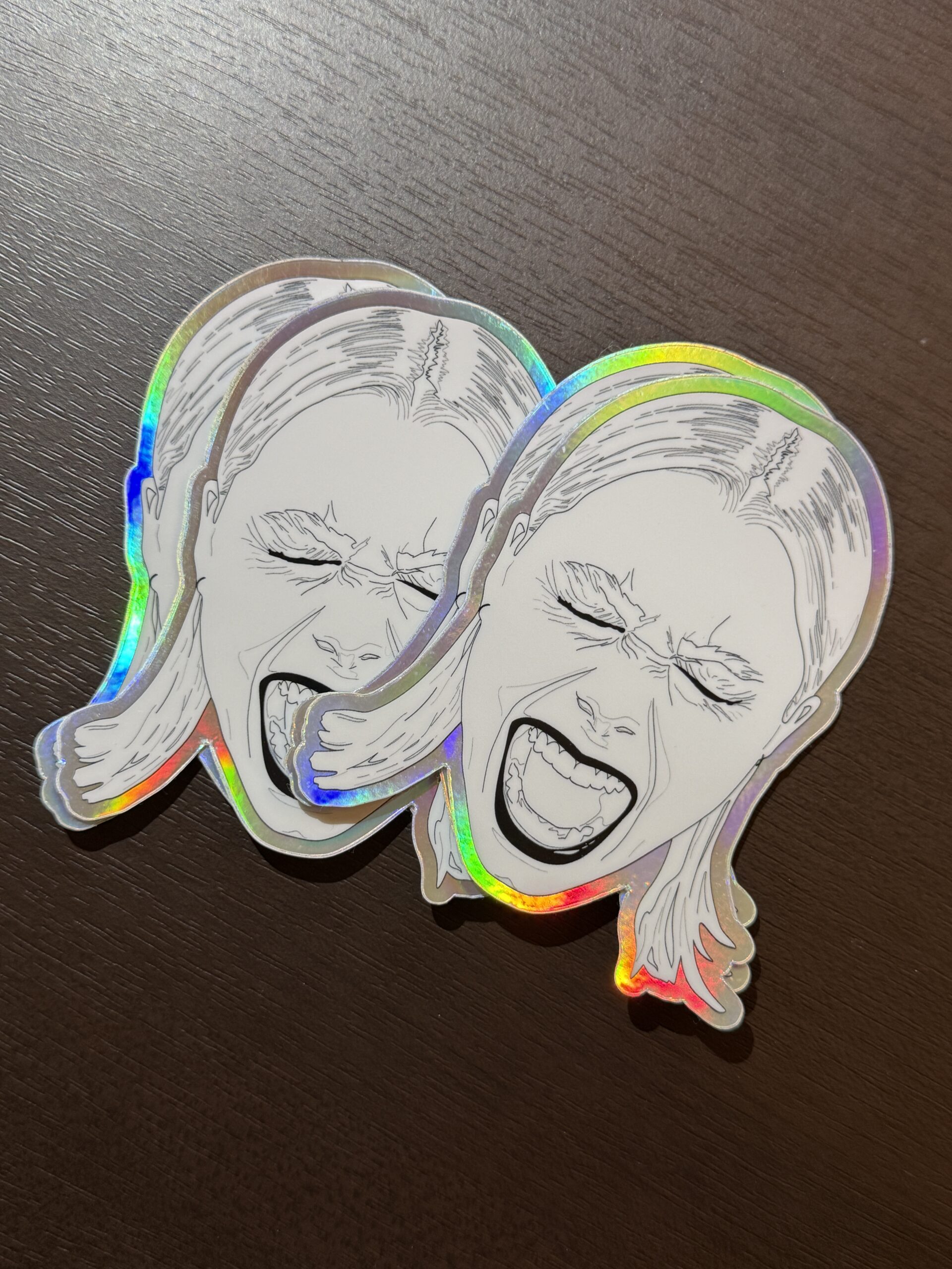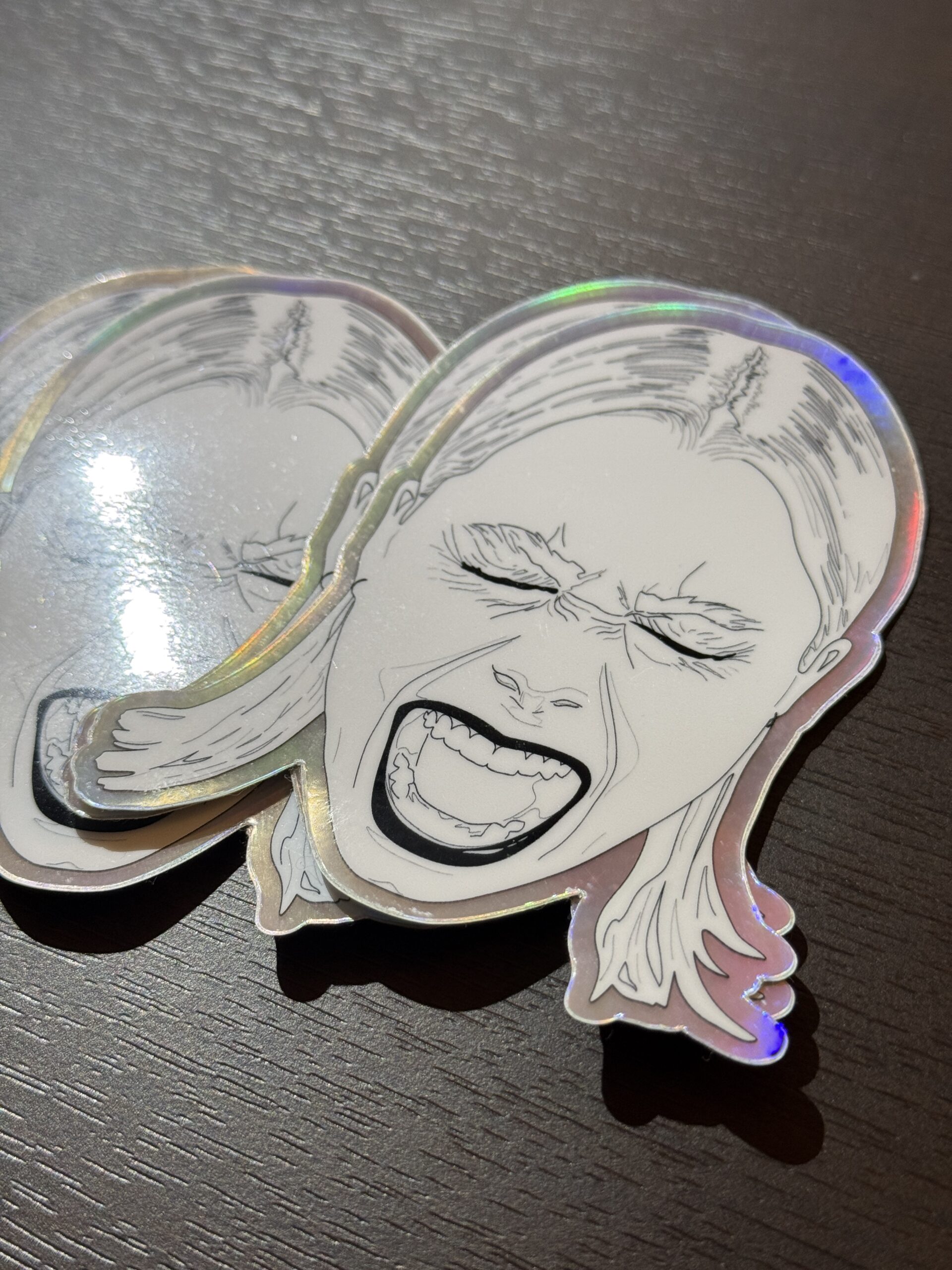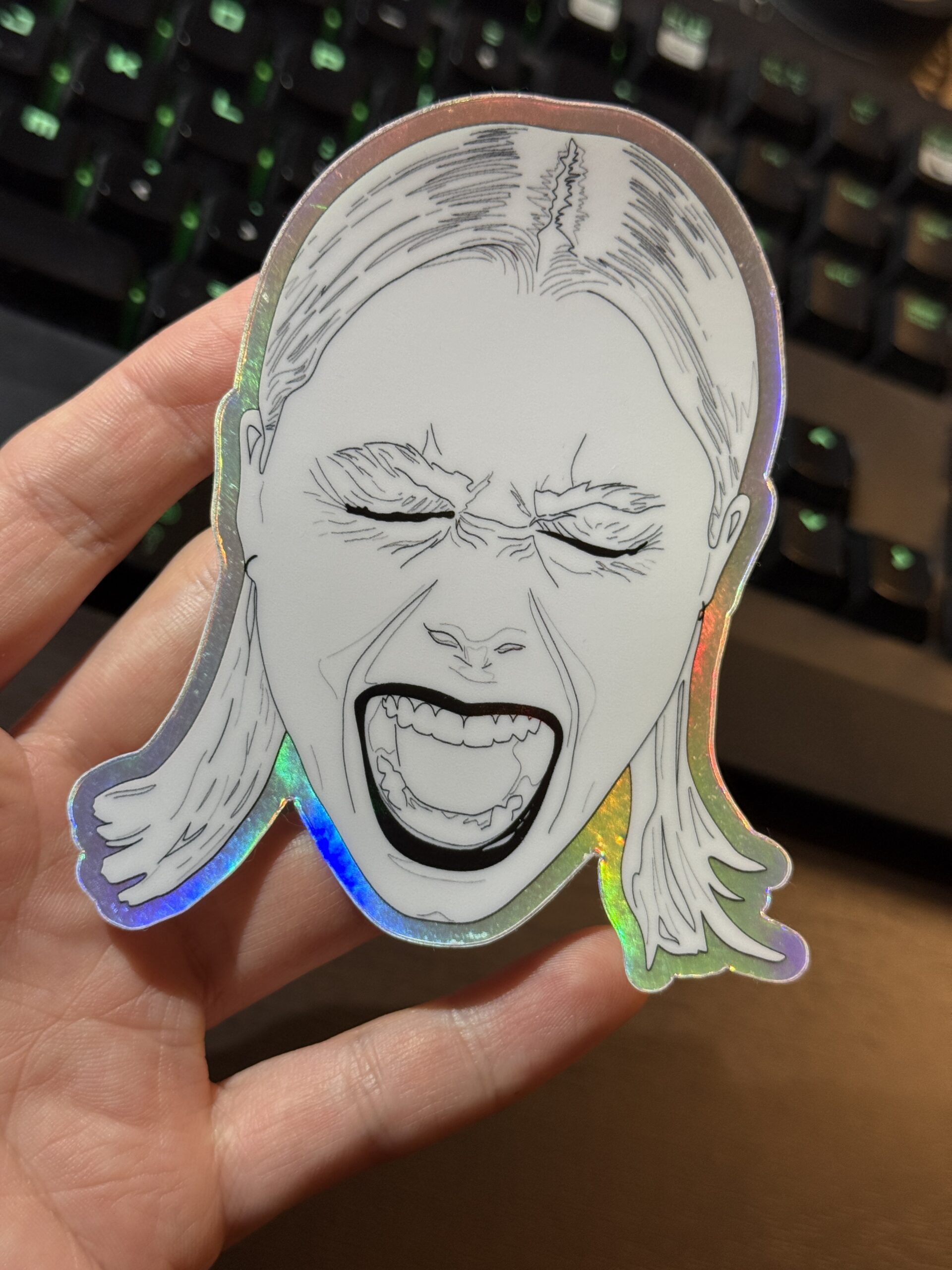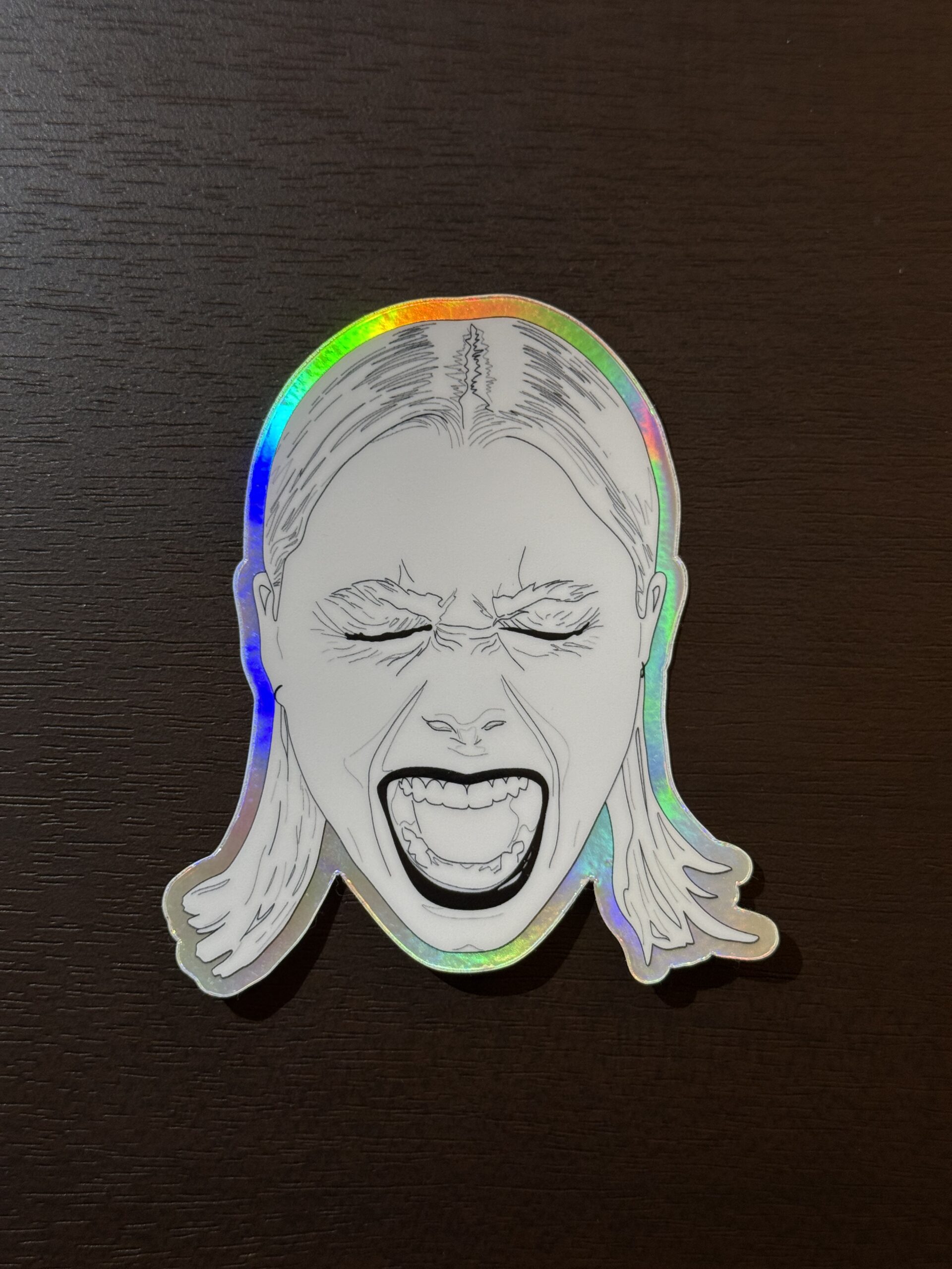 This stunning hand-drawn sticker features indie singer-songwriter Phoebe Bridgers screaming, illustrated from the photograph by Chloe Horseman. A holographic border outlines the portrait with a pop!